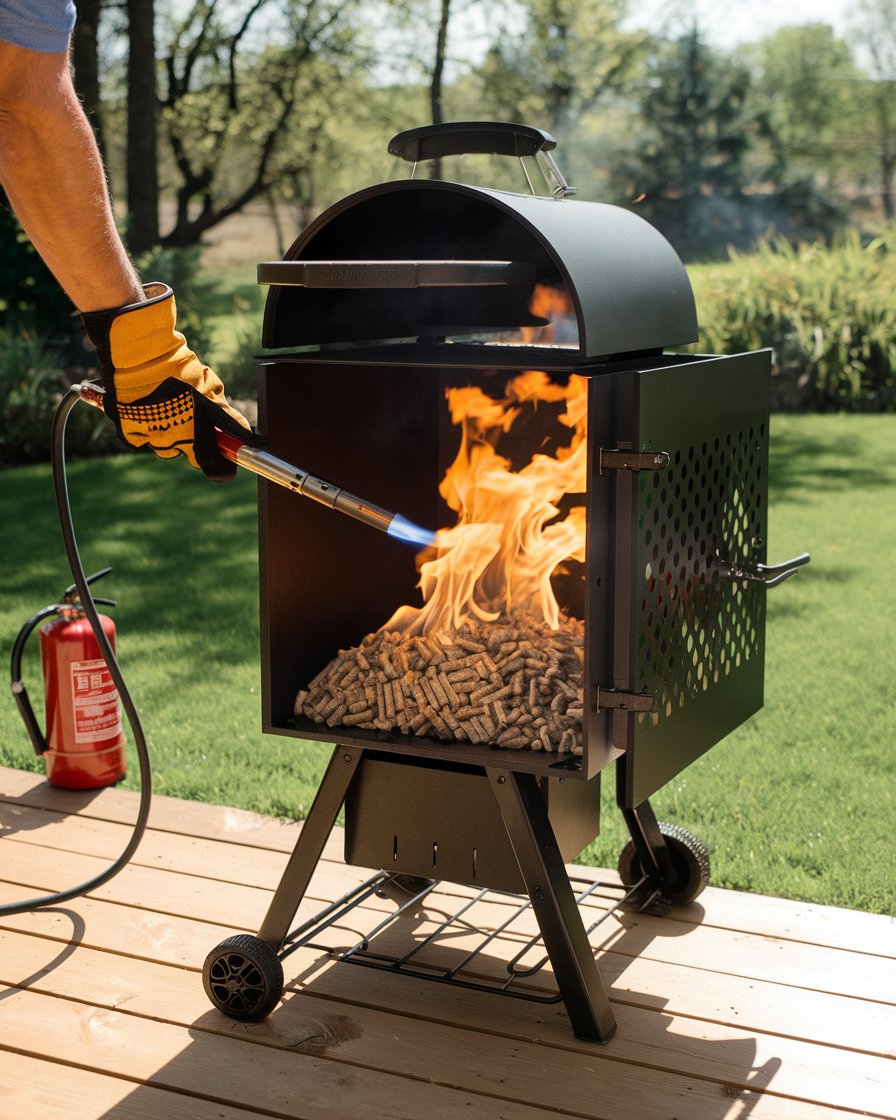 - Use a propane torch or fire starter to ignite the pellets evenly, avoiding lighter fluids that may cause flare-ups.