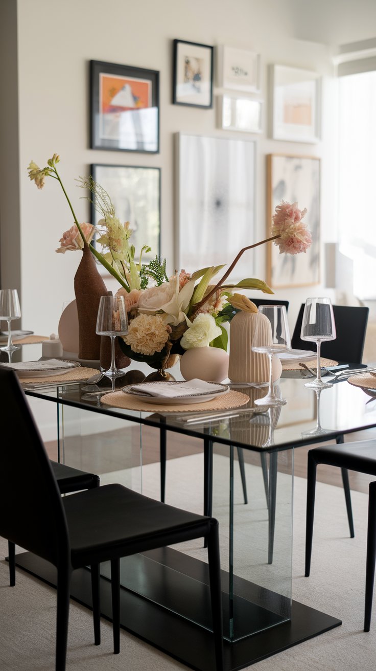 3. A well-curated dining table setup, featuring elegant centerpieces and gallery walls, serves as the focal point of the room.