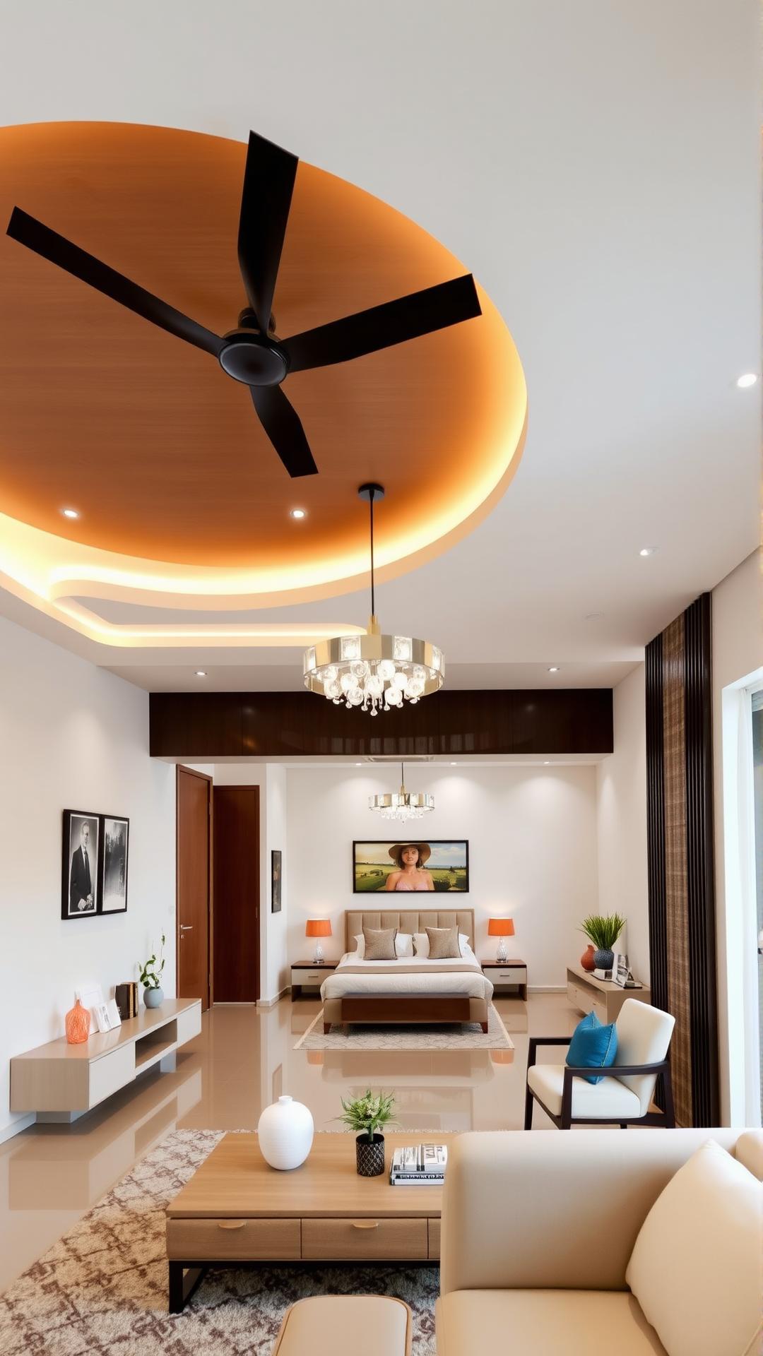 Turning to the bedroom, the ceiling design should evoke tranquility and relaxation. A popular idea is an indirect lighting setup where LED strips are hidden behind a false ceiling’s ledge. This design creates a soft, ambient glow, perfect for creating a calming environment. Another approach is the use of a fabric-wrapped ceiling, which can introduce color, texture, and a gentle sound-dampening effect. This makes it an ideal treatment, especially if the room’s decor leans towards a soft, comforting aesthetic.