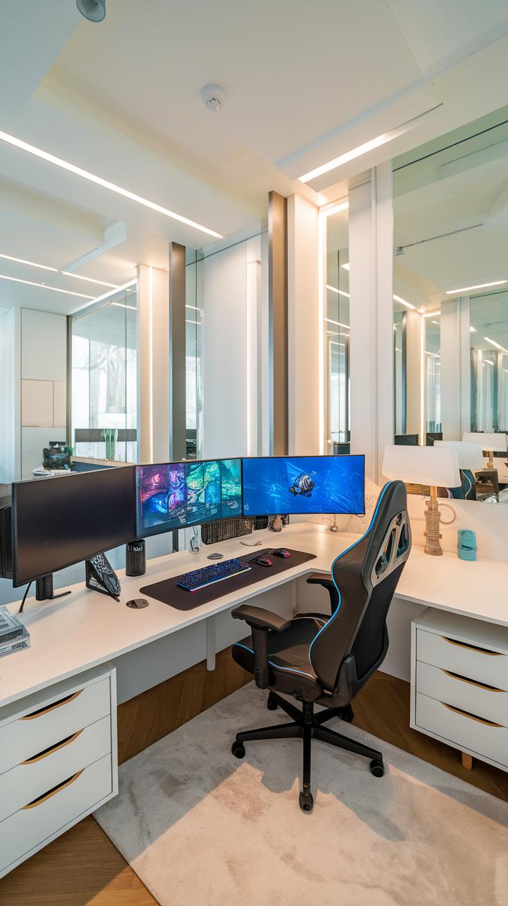 Choosing the right lighting transforms a gamer bedroom into the ultimate play space. Start with ambient lighting. This type creates a soft, overall glow that sets a comfortable atmosphere. Ceiling-mounted lights, floor lamps, or LED strip lights around the edges of the room work well for this purpose. They help reduce eye strain during long gaming sessions and create a welcoming environment.