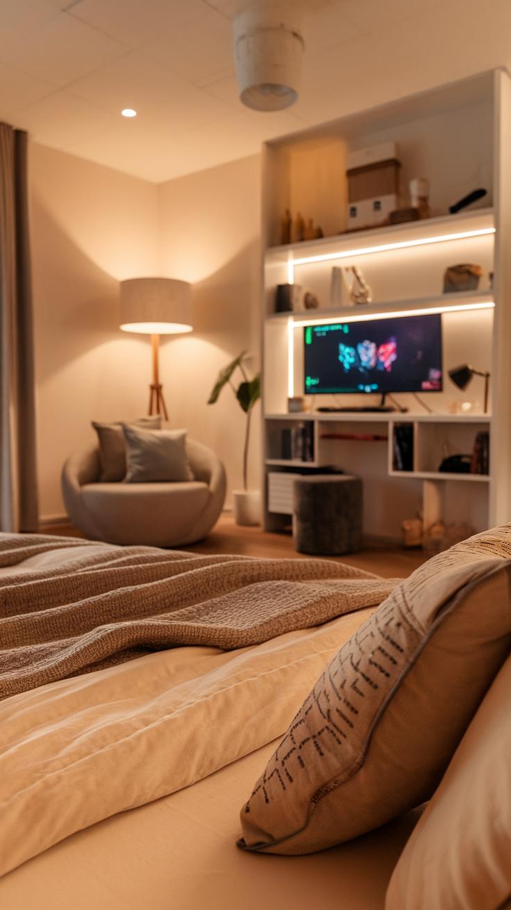Smart storage plays a big role in making your bedroom versatile. Use under-bed storage boxes for your gaming accessories and clothing. Floating shelves can hold collectibles, plants, or books, freeing up floor space. A multi-purpose gaming chair can provide comfort during long sessions and serve as extra seating for friends. By using creative storage options, you keep everything organized and maintain an inviting space that’s perfect for gaming or relaxing.