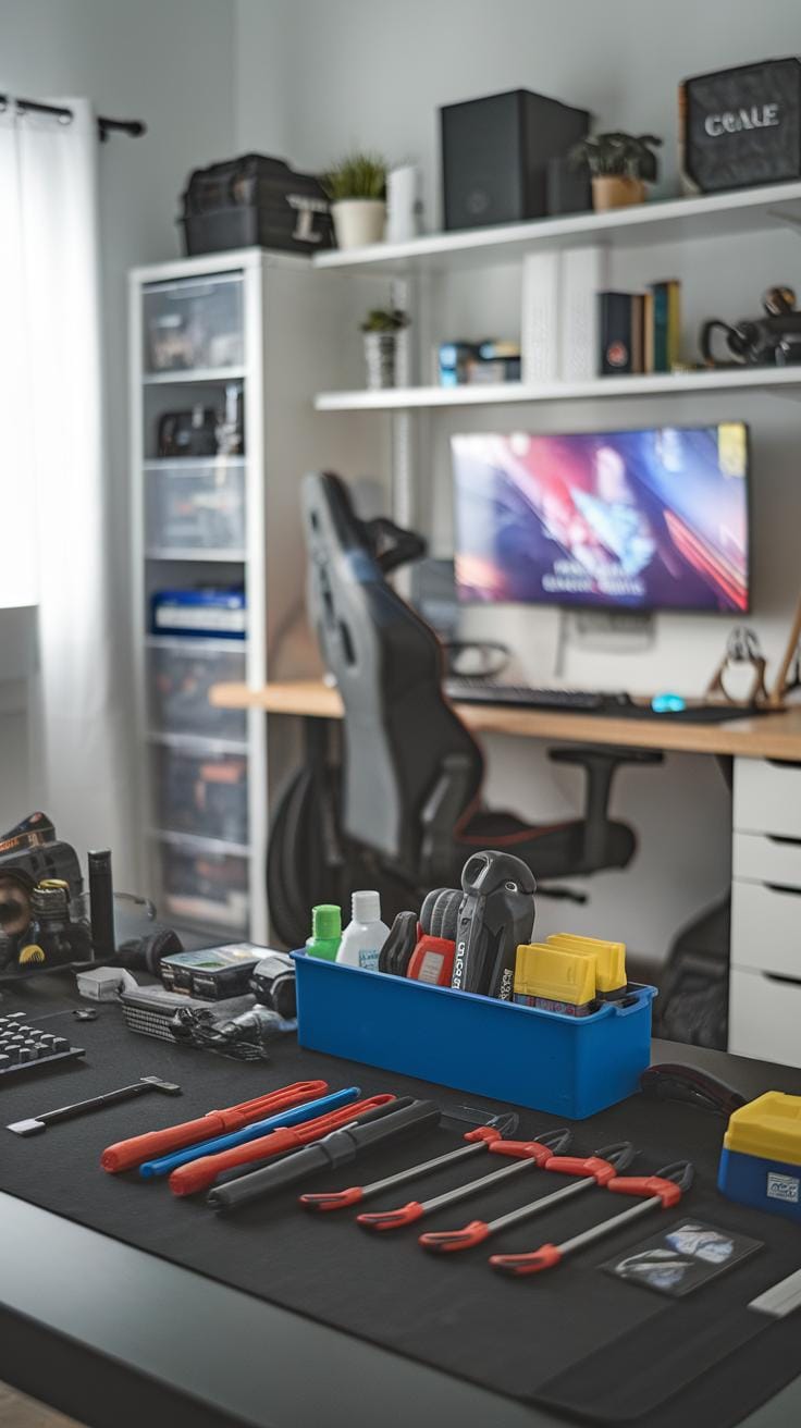 Gaming-specific storage solutions, like drawer units designed for controllers and headsets, bring efficiency and accessibility. Consider a gaming tower that holds multiple consoles and accessories in one place. Wall-mounted racks save floor space and keep everything in reach. Use labeled bins to categorize items, making it easy to locate gear during intense gaming sessions. An organized gamer room enhances your experience, letting you focus on what truly matters: playing!