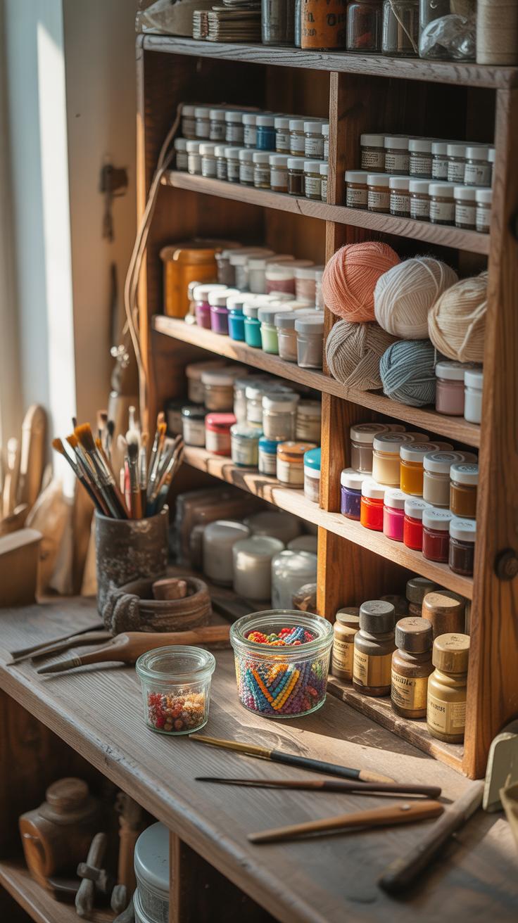Clear plastic containers with adjustable compartments are great if you work with lots of small parts—beads, screws, or buttons, for example. Shelves with built-in bins let you stack supplies vertically, saving floor space while keeping everything visible.