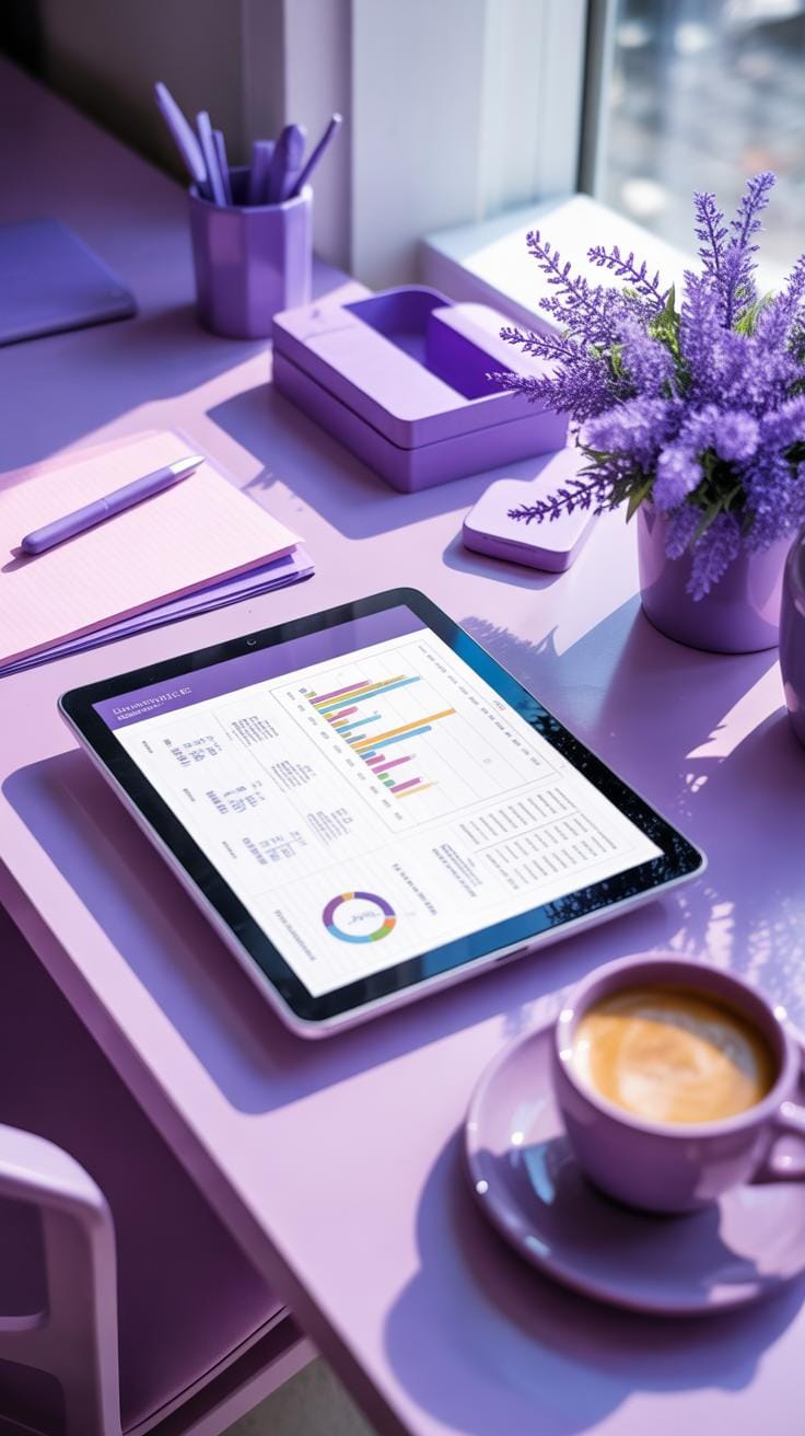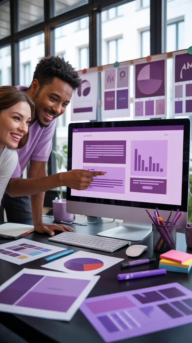 Color pairing can enhance or soften the purple. Think about pairing purples with soft grays for tech designs or gold and cream for luxury marketing. Tools like Adobe Color or Coolors help you explore shades and harmonious pairings quickly. Even simpler apps like Canva offer premade purple palettes if you want a fast start.