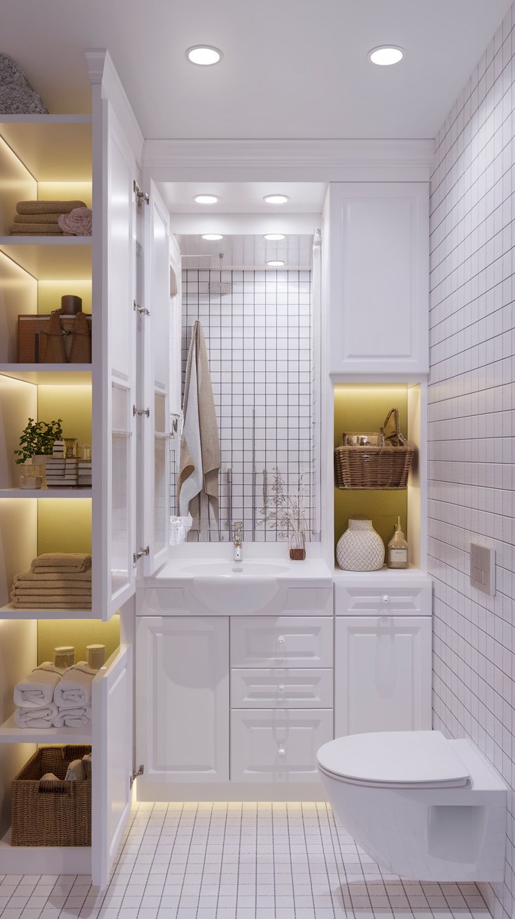 Another clever built-in solution is a bench with hidden storage. If you have space, a small bench can double as a place to sit while getting ready and offer additional space to store towels or bathroom supplies. This approach not only elevates functionality but also adds a layered design aspect to your small bathroom.