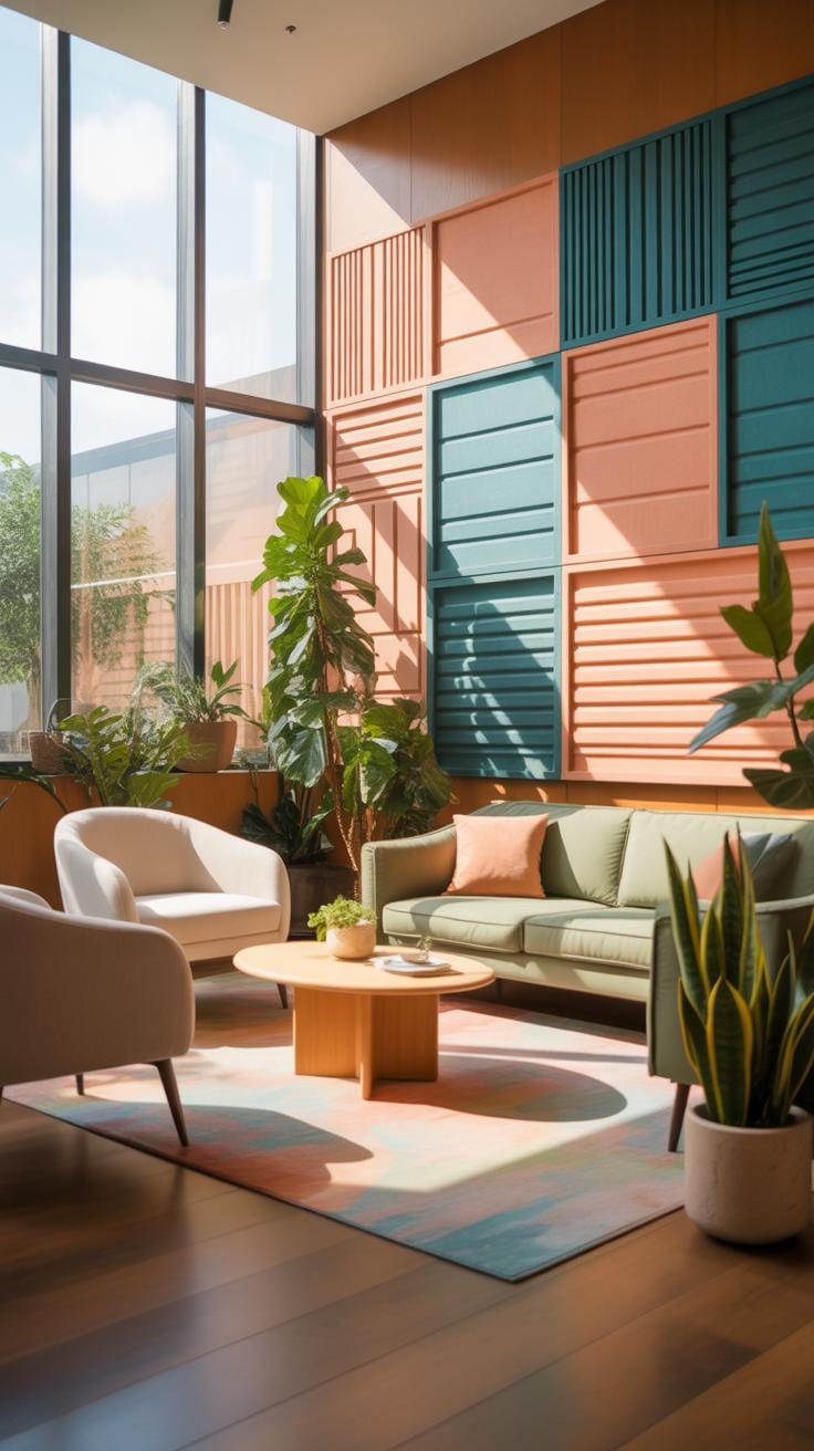 For a larger team, therapy room ideas take on a different scale. Instead of isolated desks, zones are created for quiet work and soft social interactions. Sound-absorbing panels and gentle, adjustable lighting help reduce sensory overload. Plants divide spaces subtly, adding color and a sense of life without noise. Comfortable seating areas with cushions invite relaxed collaboration, while separate quiet booths allow for mental breaks.