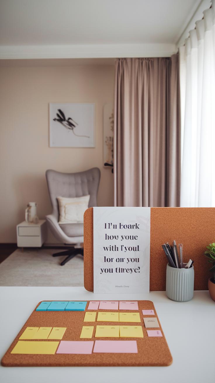 Organize these items so they don’t compete with your work tools. Use shelves or small display areas to keep the desk surface clear. Rotating items occasionally can keep the space fresh without adding clutter. Consider a vision board or a bulletin board for inspirational quotes or goals.